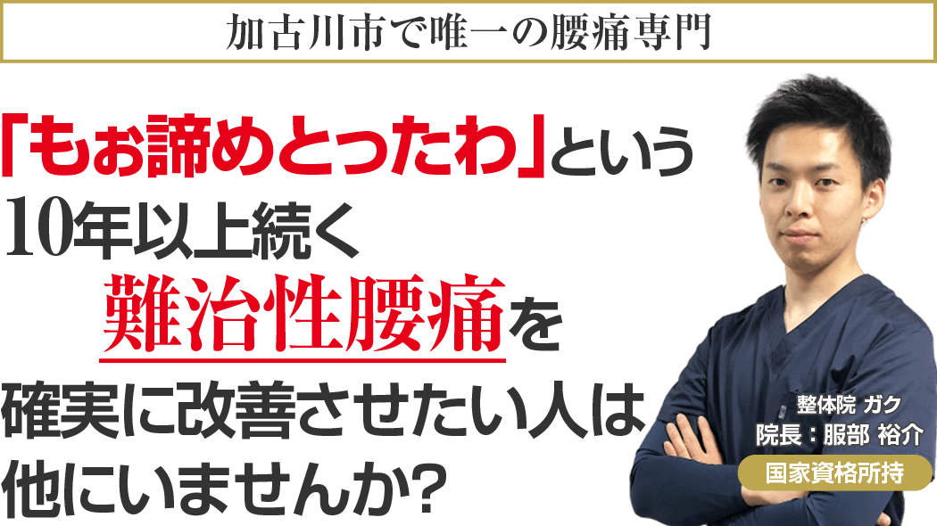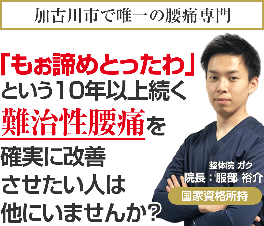 国家資格を保持し、ドクターからも信頼される医学的な考察と全国で治療家向けセミナー講師をする程の技術を持ち、あなたのことを本気で考える加古川市で唯一の腰痛専門整体院ガクに来院し、もう二度とその痛みに我慢することのない人生を手に入れる道。