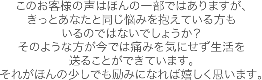 - 立っているだけ、歩くだけでも痛い、痛くて長い時間デスクワークができないなど、生活に大きく支障をきたしている、、、
