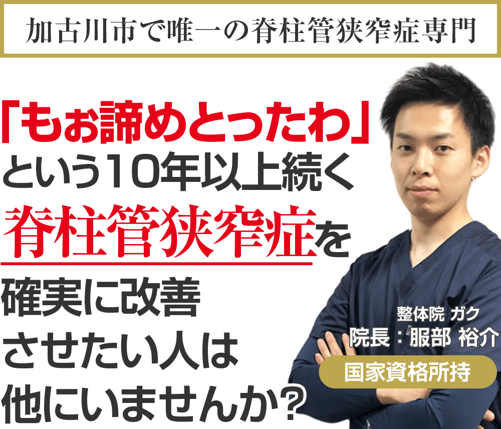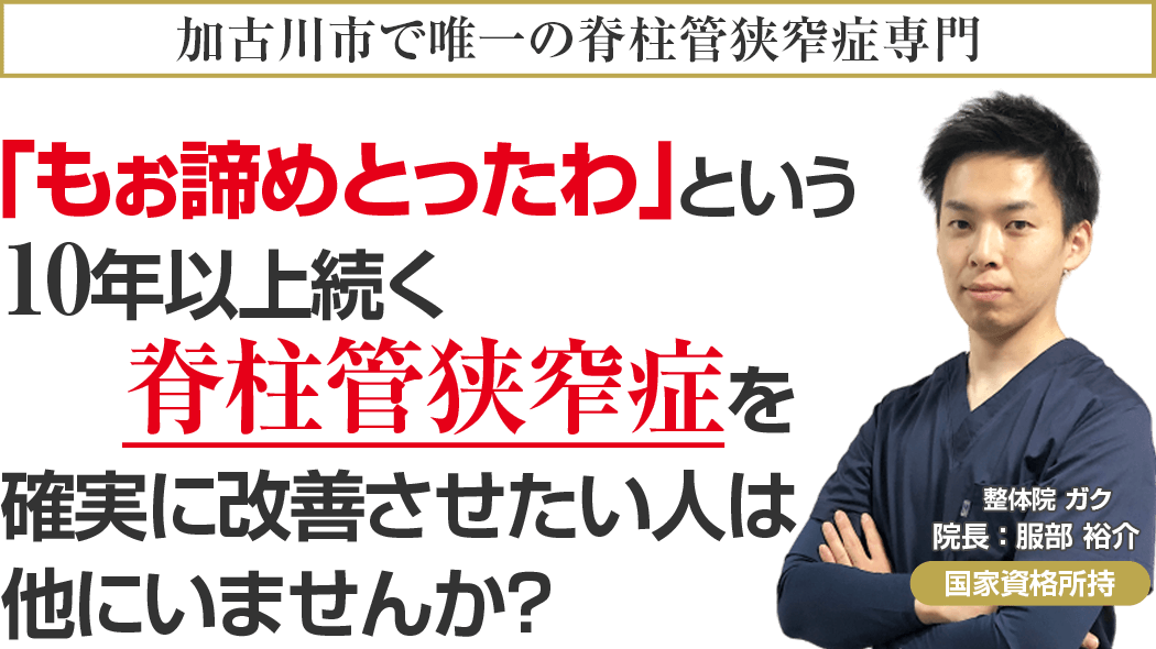国家資格を保持し、ドクターからも信頼される医学的な考察と全国で治療家向けセミナー講師をする程の技術を持ち、あなたのことを本気で考える加古川市で唯一の脊柱管狭窄症専門整体院ガクに来院し、もう二度とその痛みに我慢することのない人生を手に入れる道。