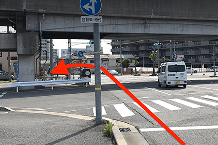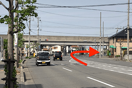 1JR高架下を通過後、すぐに左折(緑色の喫茶店手前)