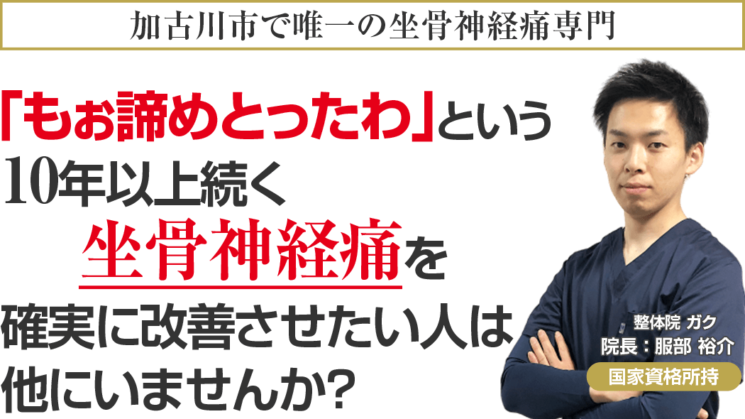 国家資格を保持し、ドクターからも信頼される医学的な考察と全国で治療家向けセミナー講師をする程の技術を持ち、あなたのことを本気で考える加古川市で唯一の坐骨神経痛専門整体院ガクに来院し、もう二度とその痛みに我慢することのない人生を手に入れる道。